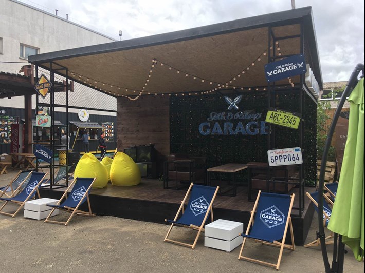 Рядом с зоной установлены столики и шезлонги: тут можно расслабиться, попробовать сеты закусок вместе с Seth&Riley’s GARAGE.